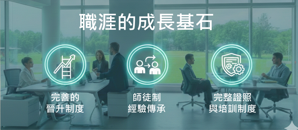 強者導師引路 (Mentorship): 我們重視經驗傳承,透過「師徒制」帶領,讓你從實作中快速累積含金量,成為獨當一面的環保專家。