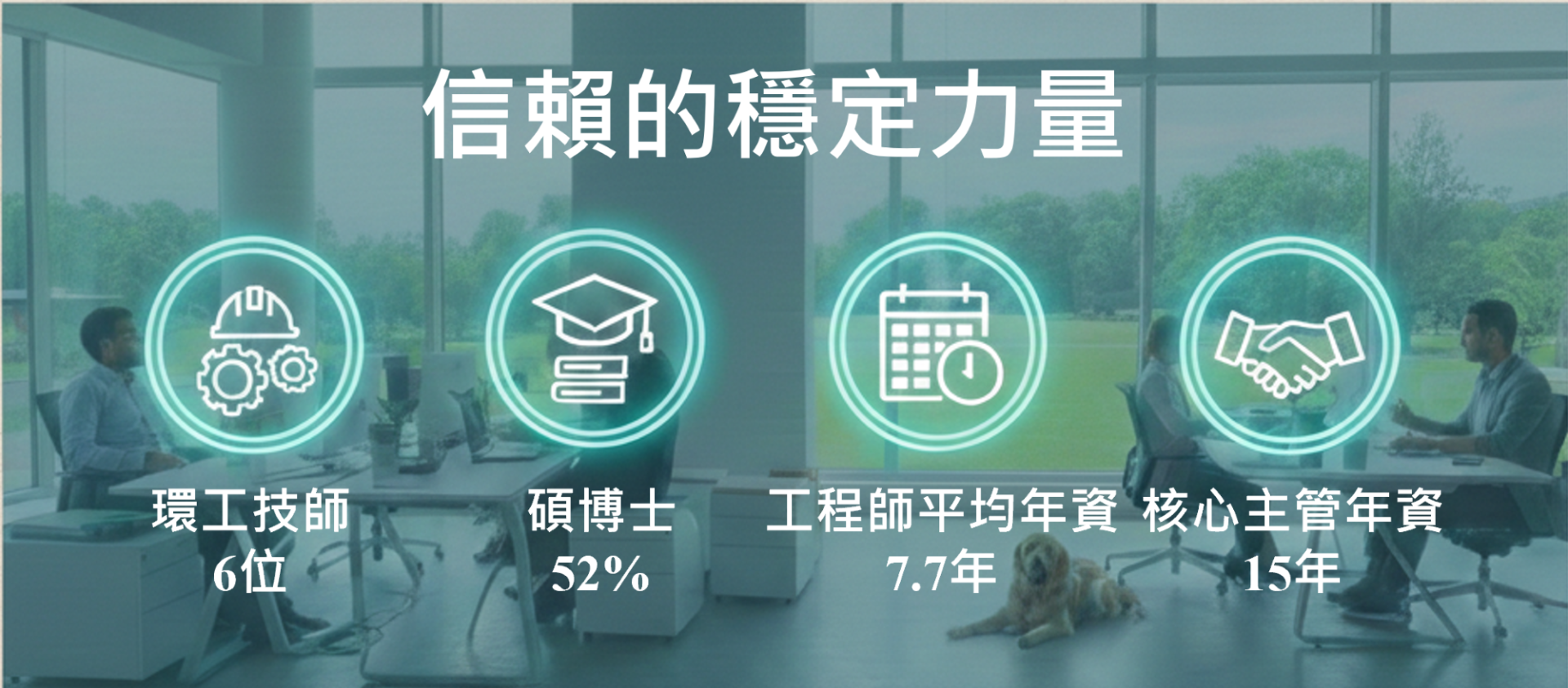 黃金陣容 (The Veteran Team): 我們引以為傲的是,各部門經理級以上主管,服務年資達 12年 以上。這意味著我們擁有豐富的實戰經驗與絕佳的團隊默契,能精準解決各類棘手的環境難題。