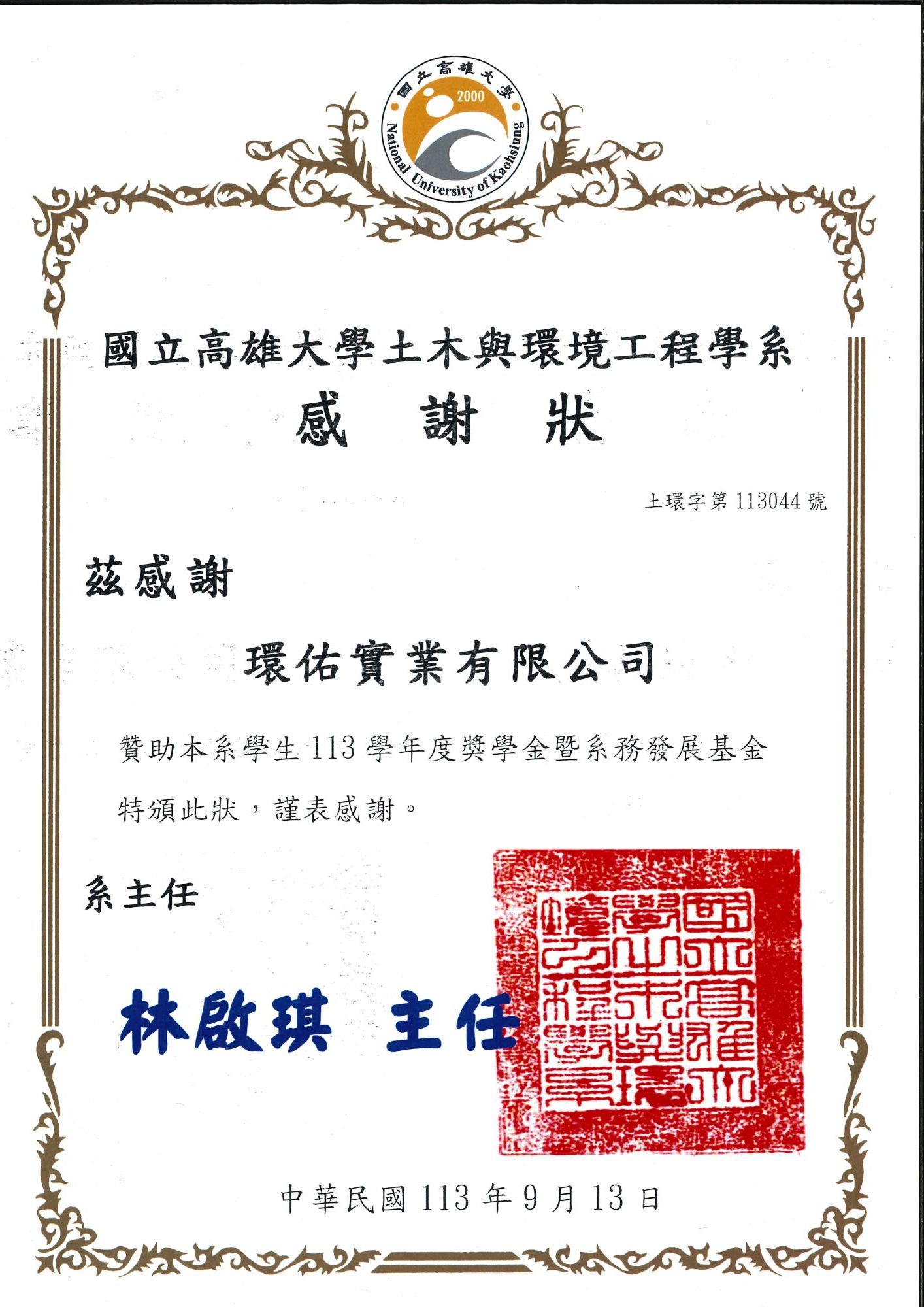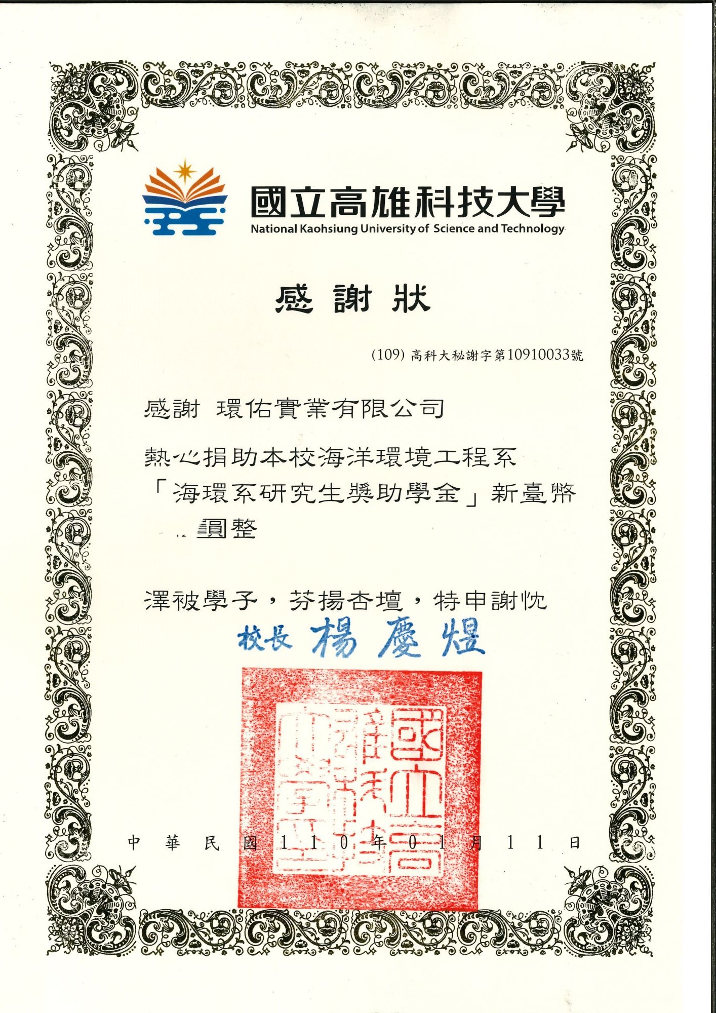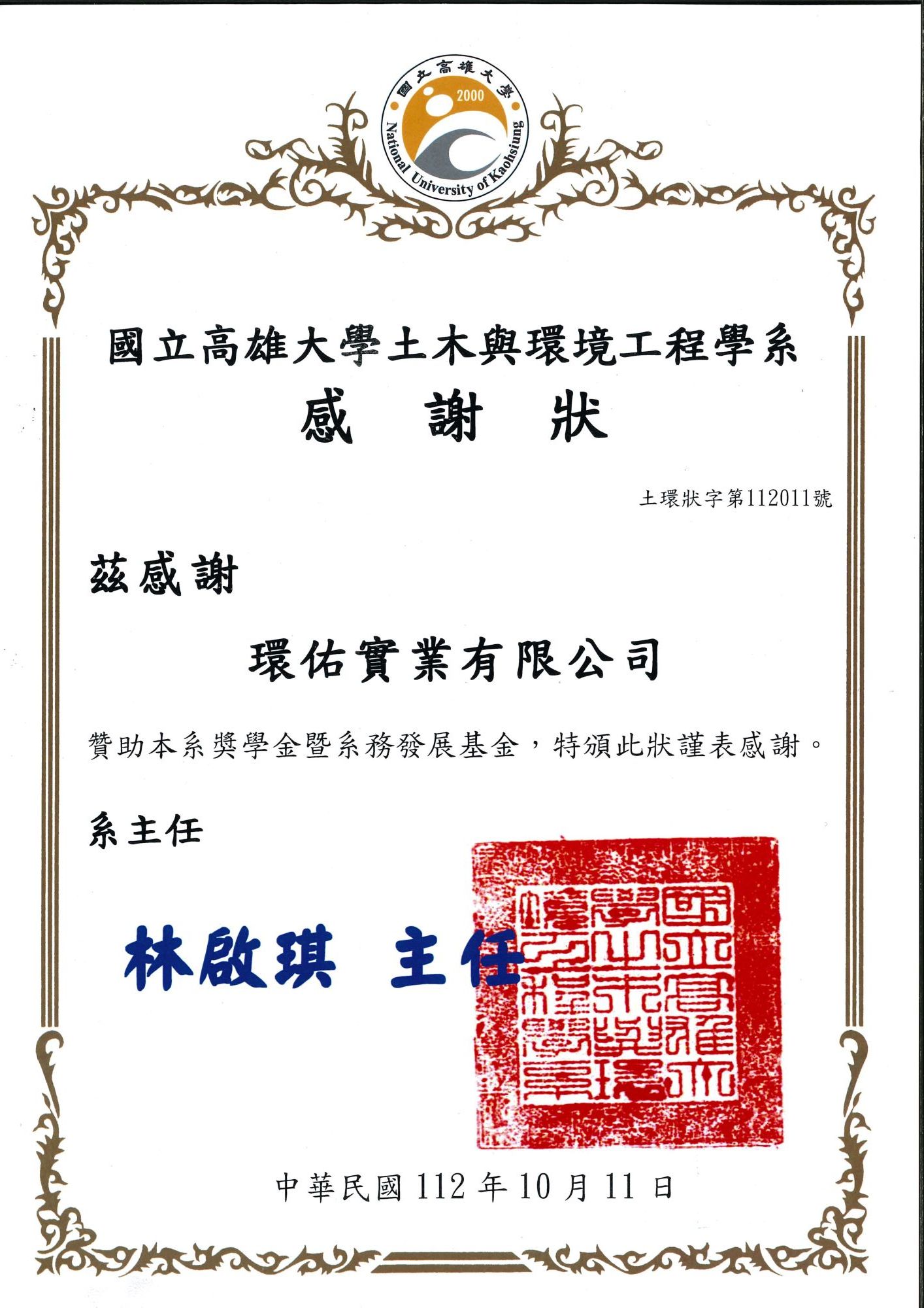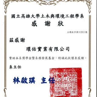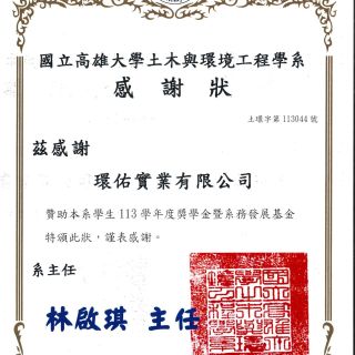 國立高雄大學土木與環境工程學系感謝狀