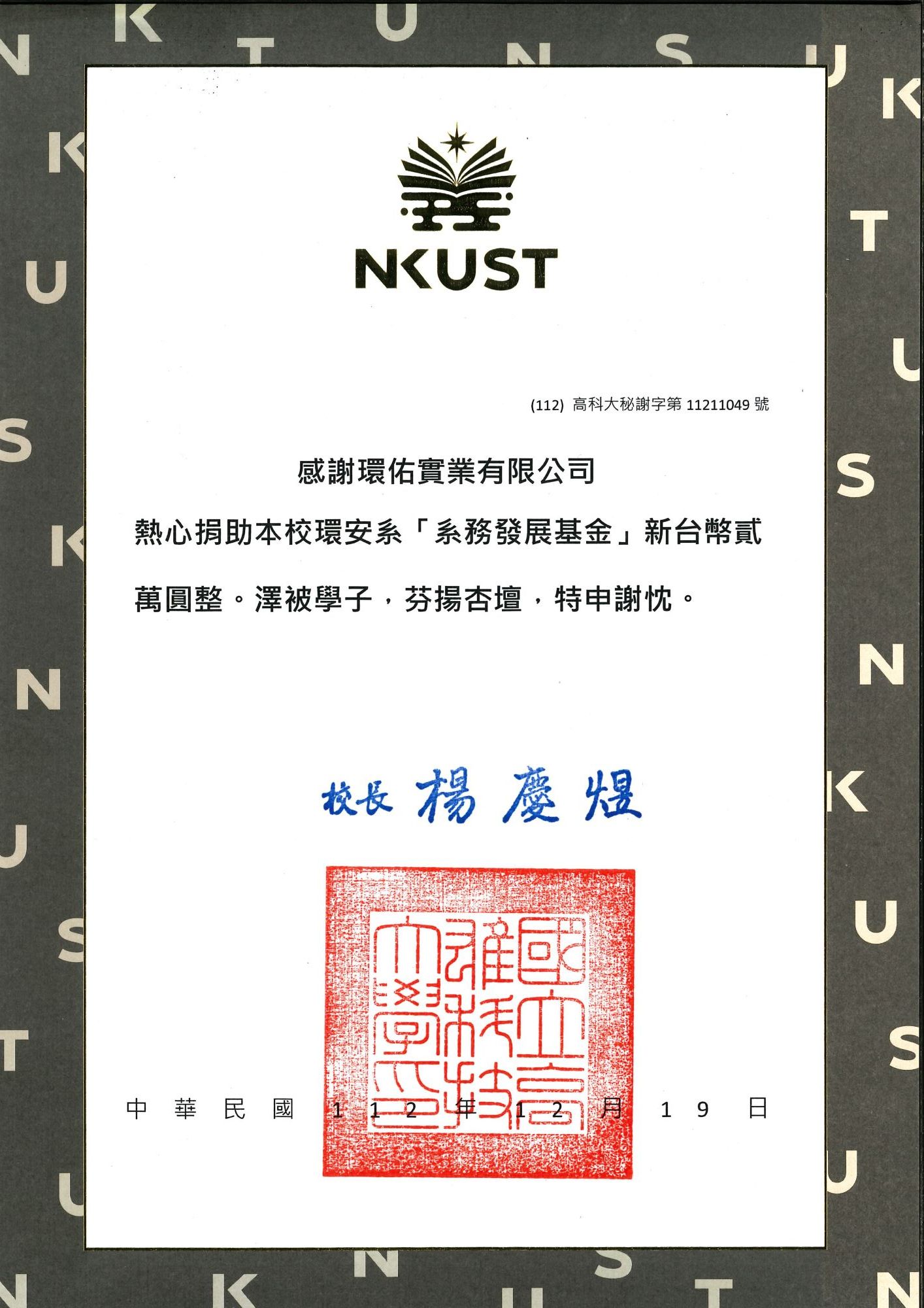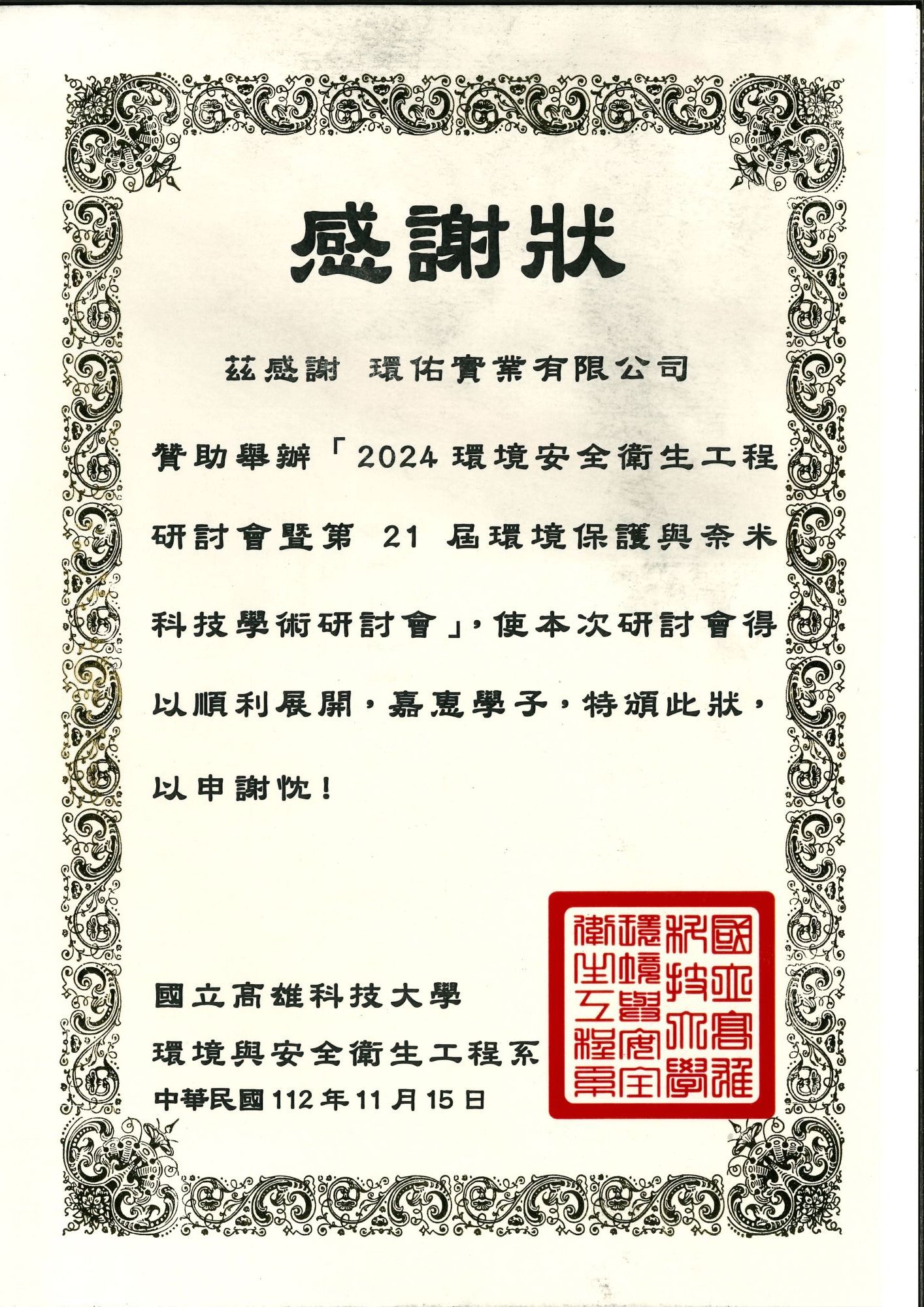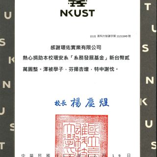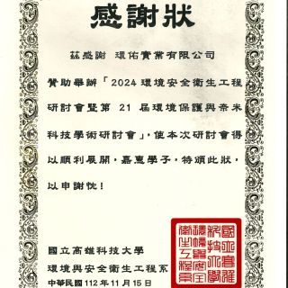 國立高雄科技大學環安系感謝狀
