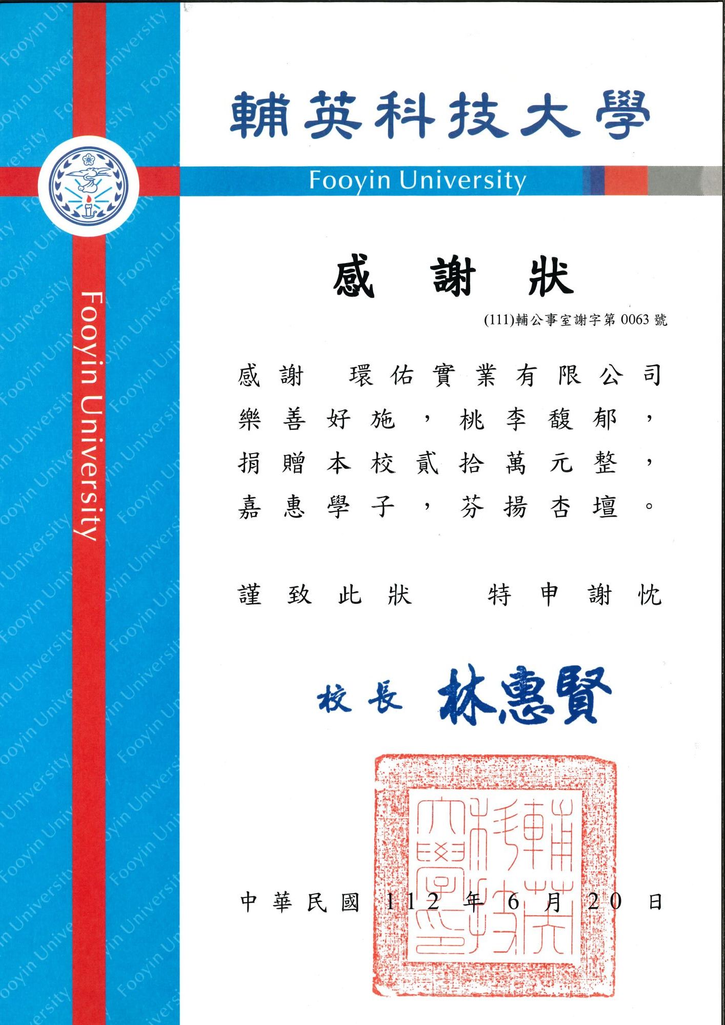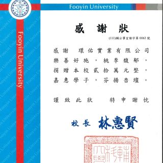 輔英科技大學感謝狀
