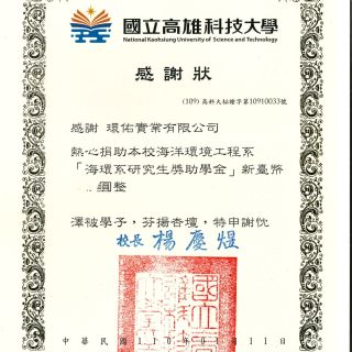 國立高雄科技大學海環系感謝狀